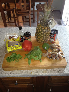 It looks like a lot, but nothing unusual here. Basil and mint, brown sugar, fish sauce, prepared red curry sauce (I would have like to make my own but unless you're growing your own peppers red chiles are tough to come by), red pepper, snow peas, shrimp, lime, pineapple and coconut milk,