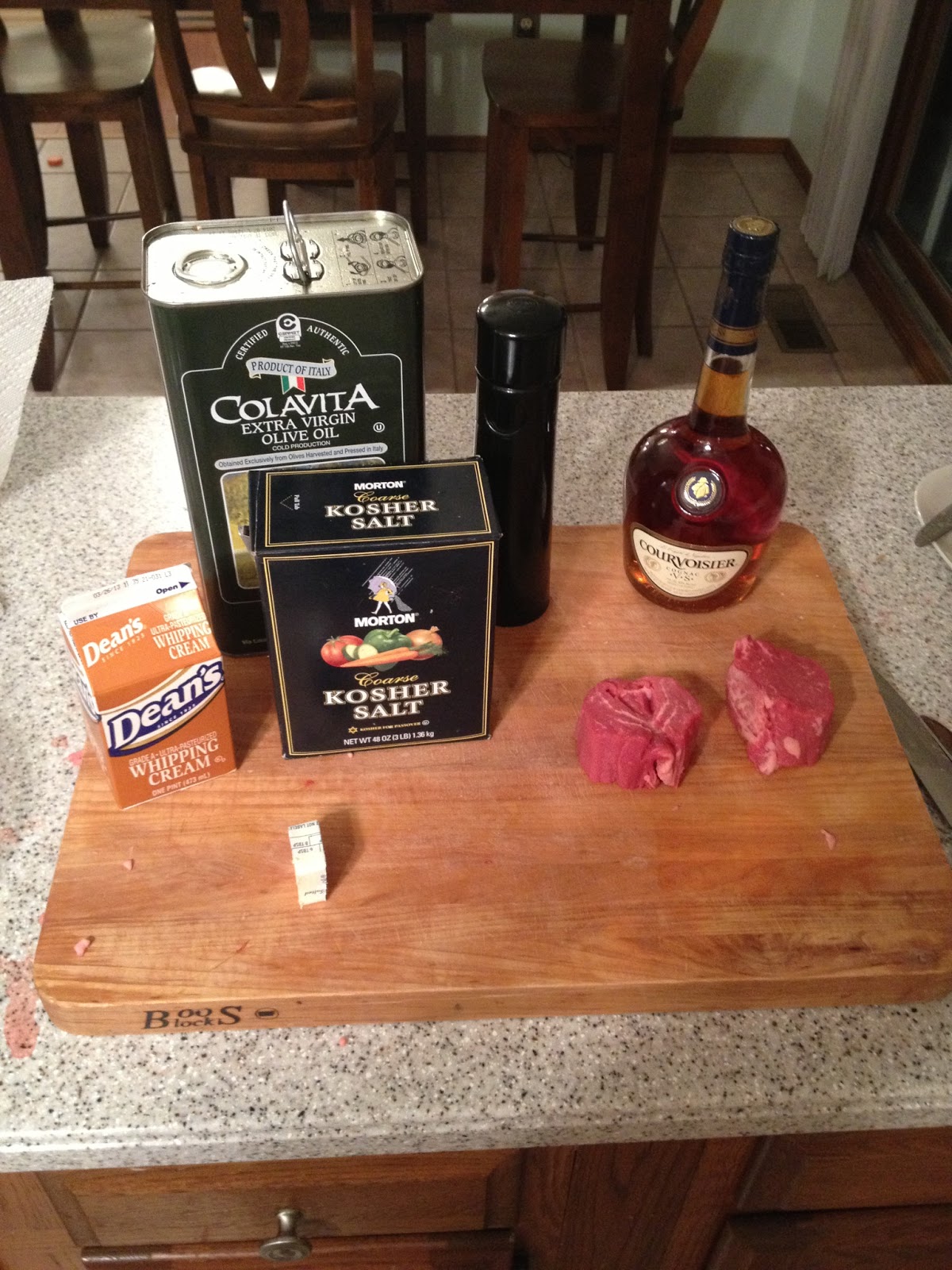And here is everything you need for this dish. I cut off two steaks from the tenderloin and everything else includes butter, salt, pepper, cream, olive oil and cognac.